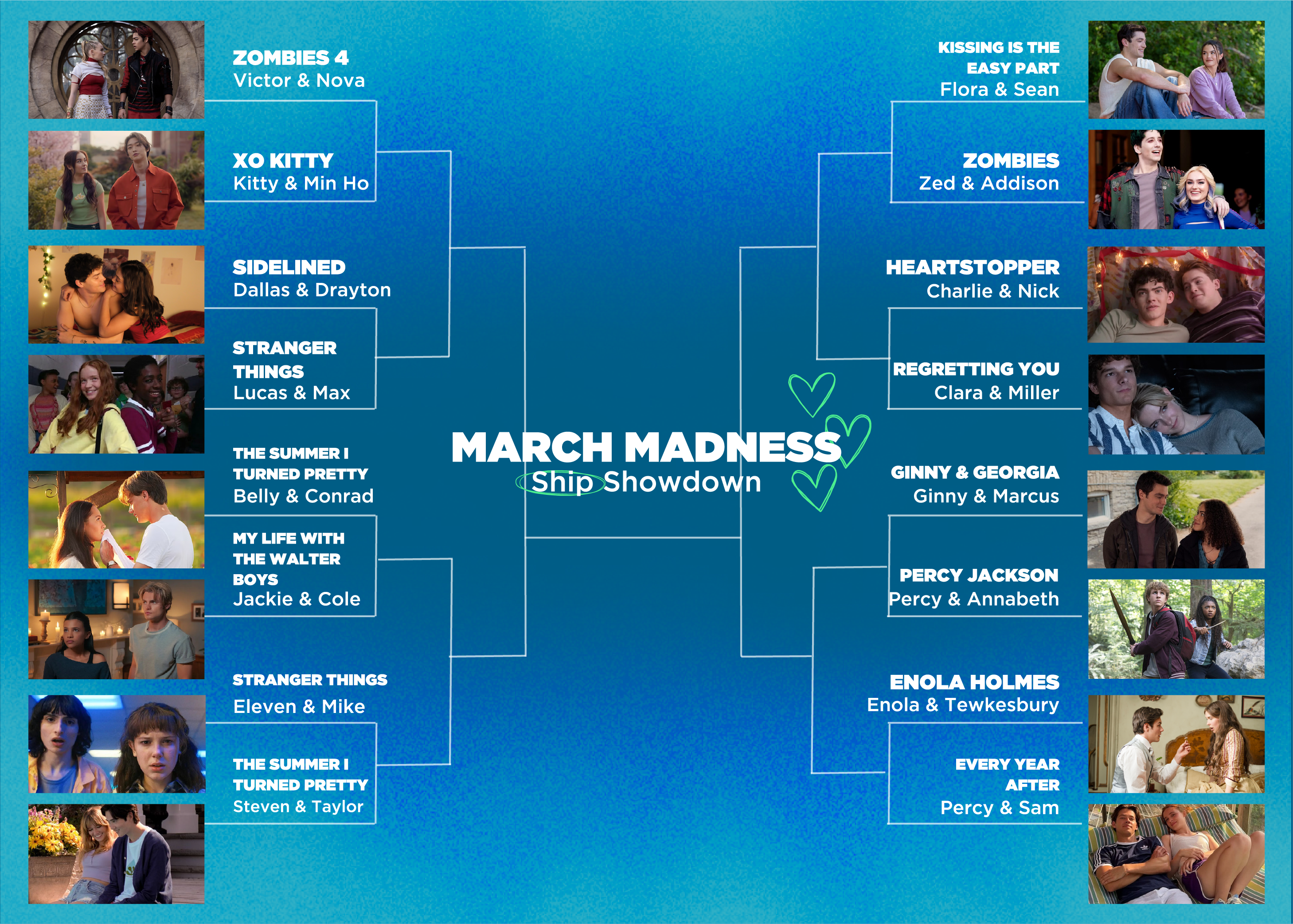 March Madness continues to remain one of the biggest sports tournaments in the world, where Division I men’s and women’s basketball teams compete in a single elimination tournament to determine the national champions. And what better way to celebrate than in the way we best know how– by creating our own tournament with the best ships/relationships there are in movies and TV today. Pick the ships that matter most to you, that you relate to, and are most inspired by. Tune in every Monday to pick your brackets to see which love prevails.